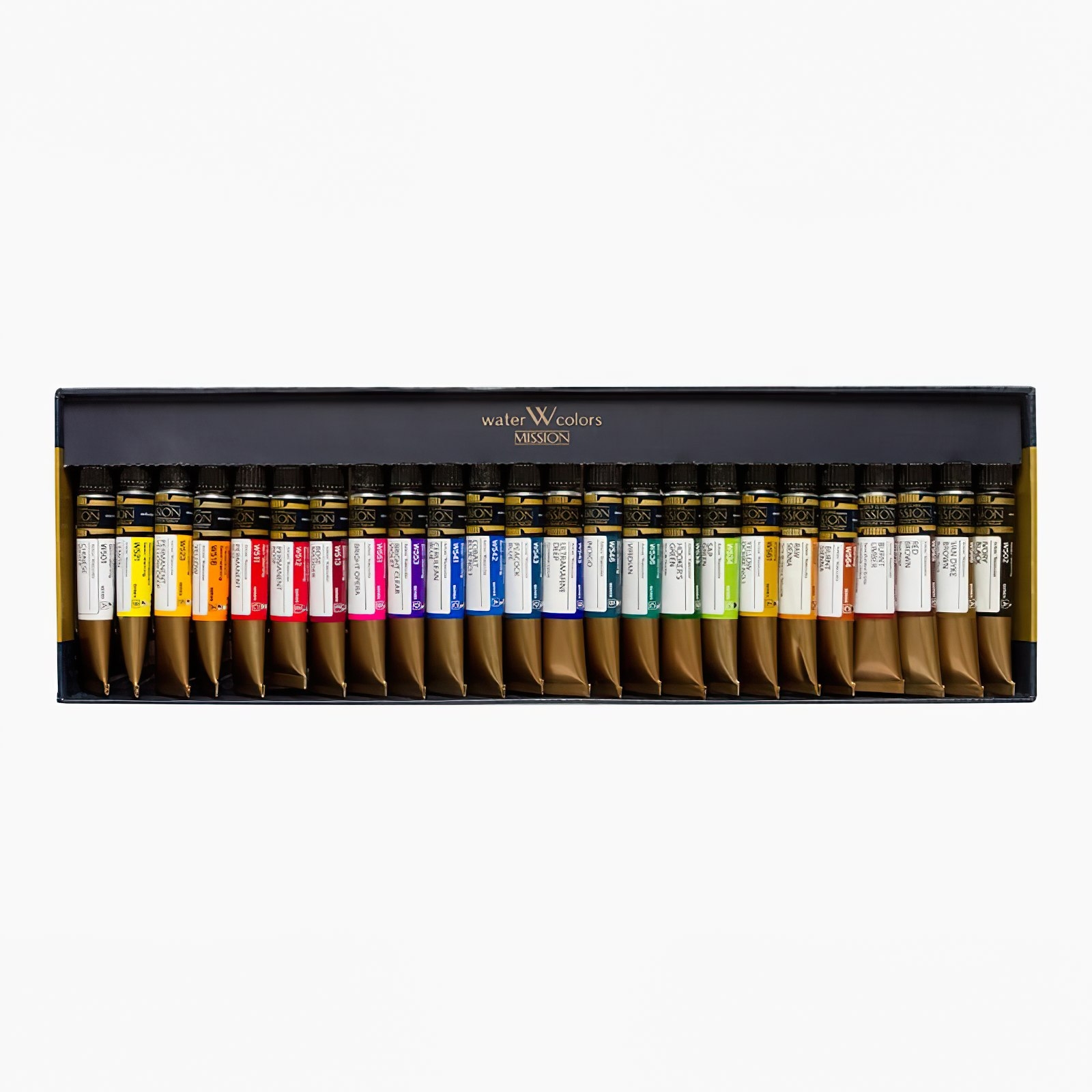 آبرنگ میجلو میشن گلد (Mijello Mission Gold) یک برند حرفهای و باکیفیت اهل کره جنوبی است. این آبرنگ به دلیل غلظت بسیار بالای پیگمنت، به رنگهای فوقالعاده زنده، شفاف و درخشان خود شهرت دارد. رنگهای این برند دارای مقاومت نوری (Lightfastness) عالی هستند و در برابر محو شدن در طول زمان بسیار مقاومند. همچنین در فرمولاسیون آنها از رنگدانههای سمی کادمیوم استفاده نشده و به همین دلیل گزینهای محبوب در میان هنرمندان حرفهای محسوب میشوند.