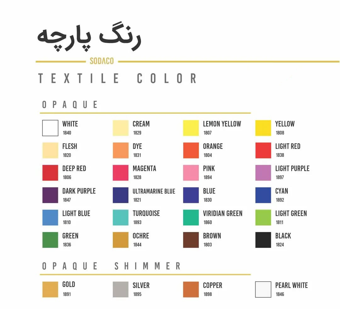 رنگ پارچه اوپک سوداکو یک محصول ایرانی است که برای نقاشی روی پارچههای تیره و رنگی طراحی شده است. ویژگی اصلی آن، قدرت پوشانندگی بالای آن است که باعث میشود رنگ زمینه پارچه را به طور کامل بپوشاند و جلوهای زنده و واضح ایجاد کند. این رنگها پس از اجرا، برای ماندگاری و قابل شستشو شدن، نیاز به تثبیت با حرارت (معمولاً اتوکشی از پشت پارچه) دارند. به همین دلیل، گزینهای اقتصادی و عالی برای شخصیسازی لباسهای تیره، کیف و دیگر منسوجات است.