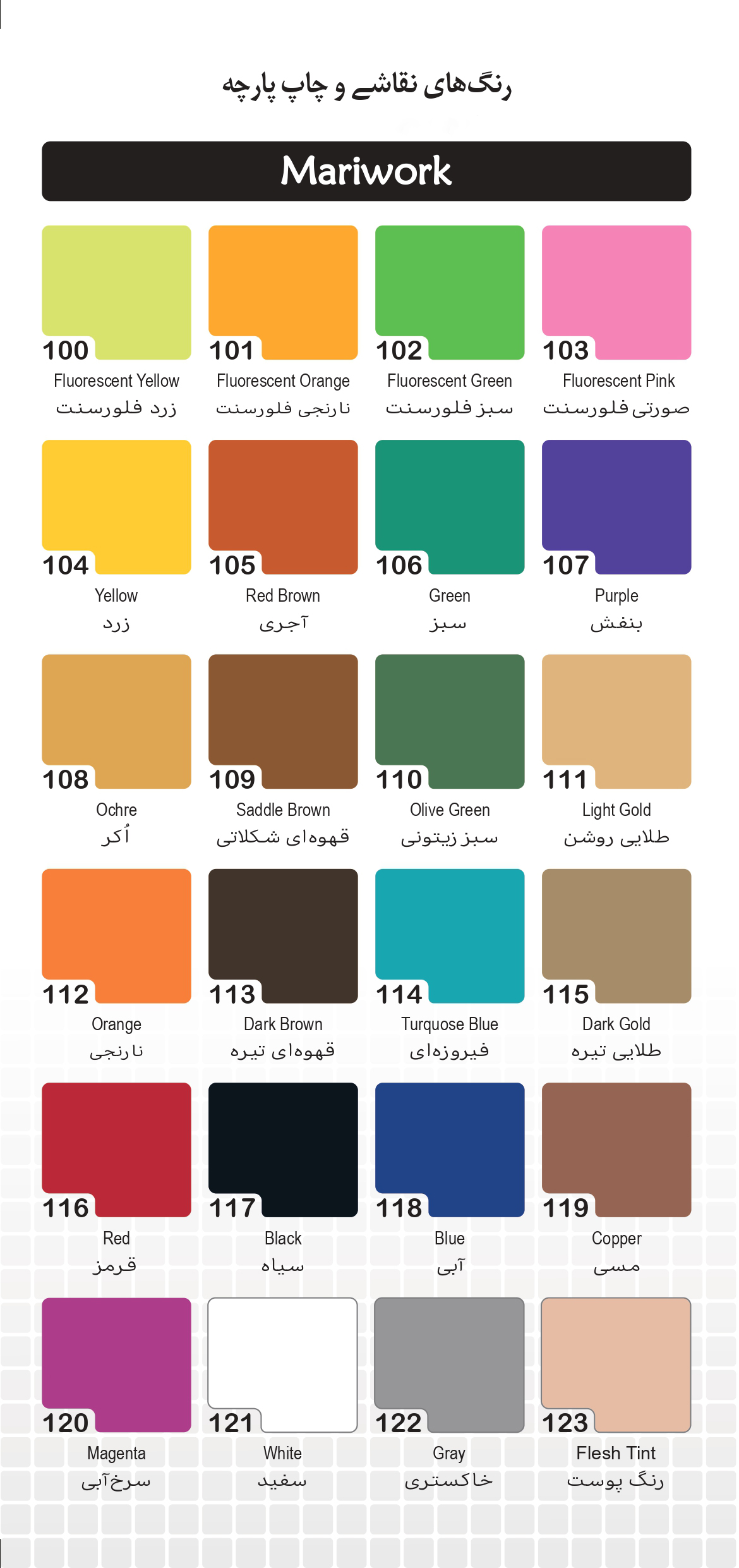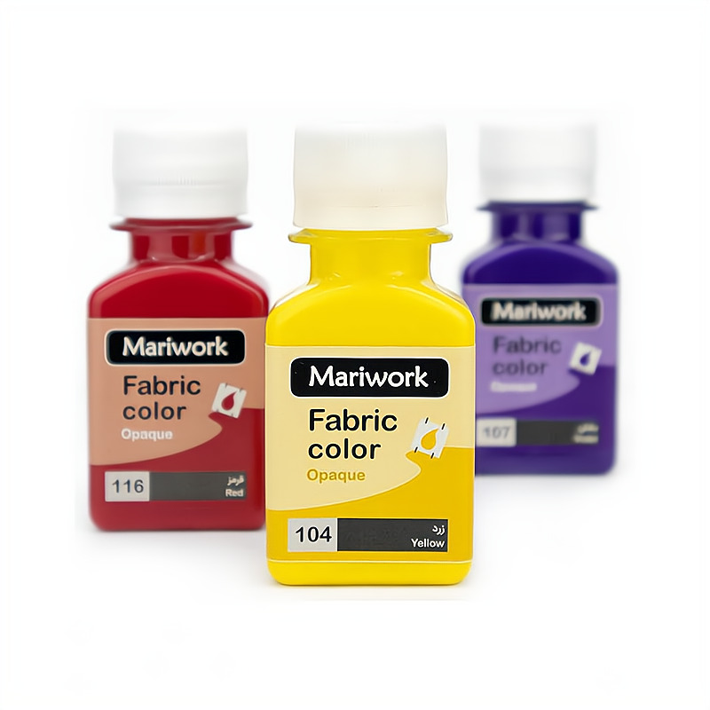 رنگ پارچه نیمه اوپک ماری ورک یک محصول شناخته‌شده و اقتصادی تولید ایران است که به طور ویژه برای استفاده روی پارچه‌های تیره و رنگی طراحی شده است. ویژگی اصلی آن، قدرت پوشانندگی بالای آن است که باعث می‌شود رنگ به خوبی روی زمینه تیره بنشیند و جلوه‌ای واضح و زنده داشته باشد. این رنگ‌ها پس از خشک شدن، برای ماندگاری و قابل شستشو شدن، به تثبیت با حرارت (معمولاً از طریق اتو کردن) نیاز دارند. به همین دلیل، گزینه‌ای محبوب برای هنرجویان و شخصی‌سازی لباس با هزینه‌ای مناسب به شمار می‌رود.
